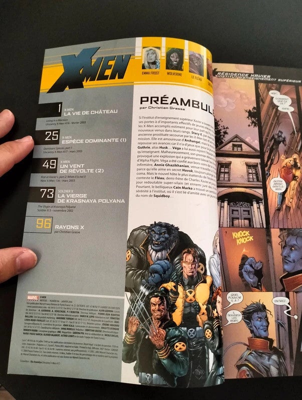 Au sommaire : Uncanny X-Men "La Vie de Château" (Uncanny X-Men 416 "Living in a Mansion" 02/2003). - Uncany X-Men "Espèce Dominante (1)" (Uncanny X-Men 417 "Dominant Specie, part 1" 03/2003). - Nex X-Men "Un Vent de Révolte (2)" (New X-Men 136 "Riot at Xavier's, part 2: When X is not X" 03/2003). - Soldiers X "La Vierge de Krasnaya Polyana" (Soldiers X" The Virgin Of Krasnaya Polyana" 11/2002).