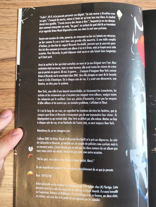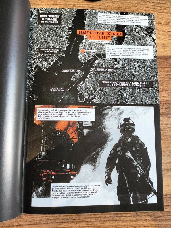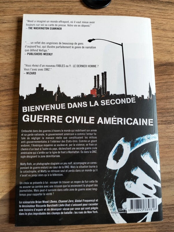 DMZ : Sur le terrain est un chef-d'œuvre de la bande dessinée, signé par le duo Brian Wood et Riccardo Burchielli. Publié en 2007 par Vertigo, ce premier tome nous plonge dans un futur proche où une guerre civile a ravagé les États-Unis. New York, épicentre du conflit, est devenue une zone démilitarisée (DMZ), un no man's land où règnent le chaos et la violence.