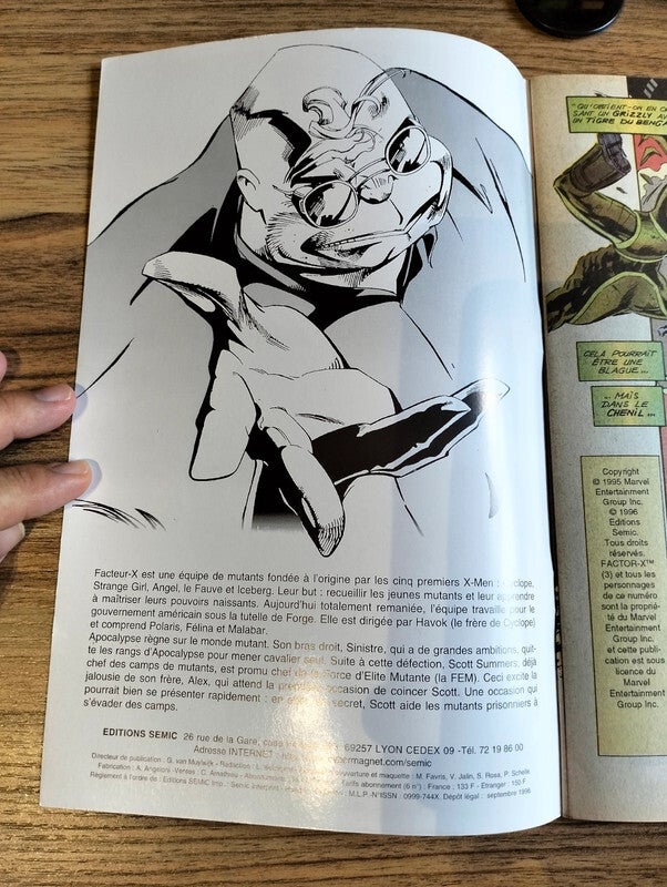 Info édition : Contient: - Factor X (I) 03 "L'ère d'Apocalypse (20): Plaies ouvertes" (Factor X (I) 03 "Open Wounds" 05/1995). - Factor X (I) 04 "L'ère d'Apocalypse (31): Représailles" (Factor X (I) 04 "Reckonings" 06/1995).