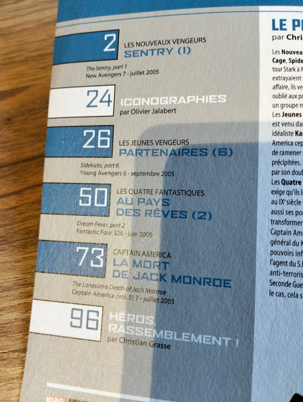Contient: - Les Nouveaux Vengeurs (I) 07 "Sentry (1)" (New Avengers (I) 07 "The Sentry part 1" 06/2005). - Les Jeunes Vengeurs (I) 06 "Partenaire (6)" (Young Avengers (I) 06 "Sidekicks (Part 6)" 09/2006). - Les Quatre Fantastiques (III) 526 "Au pays des rêves (2)" (Fantastic Four (III) 526 "Dream Fever, Part 2" 06/2005). - Captain America (V) 07 "La mort de Jack Monroe" (Captain America (V) 07 "Interlude: The Lonesome Death of Jack Monroe" 07/2005).