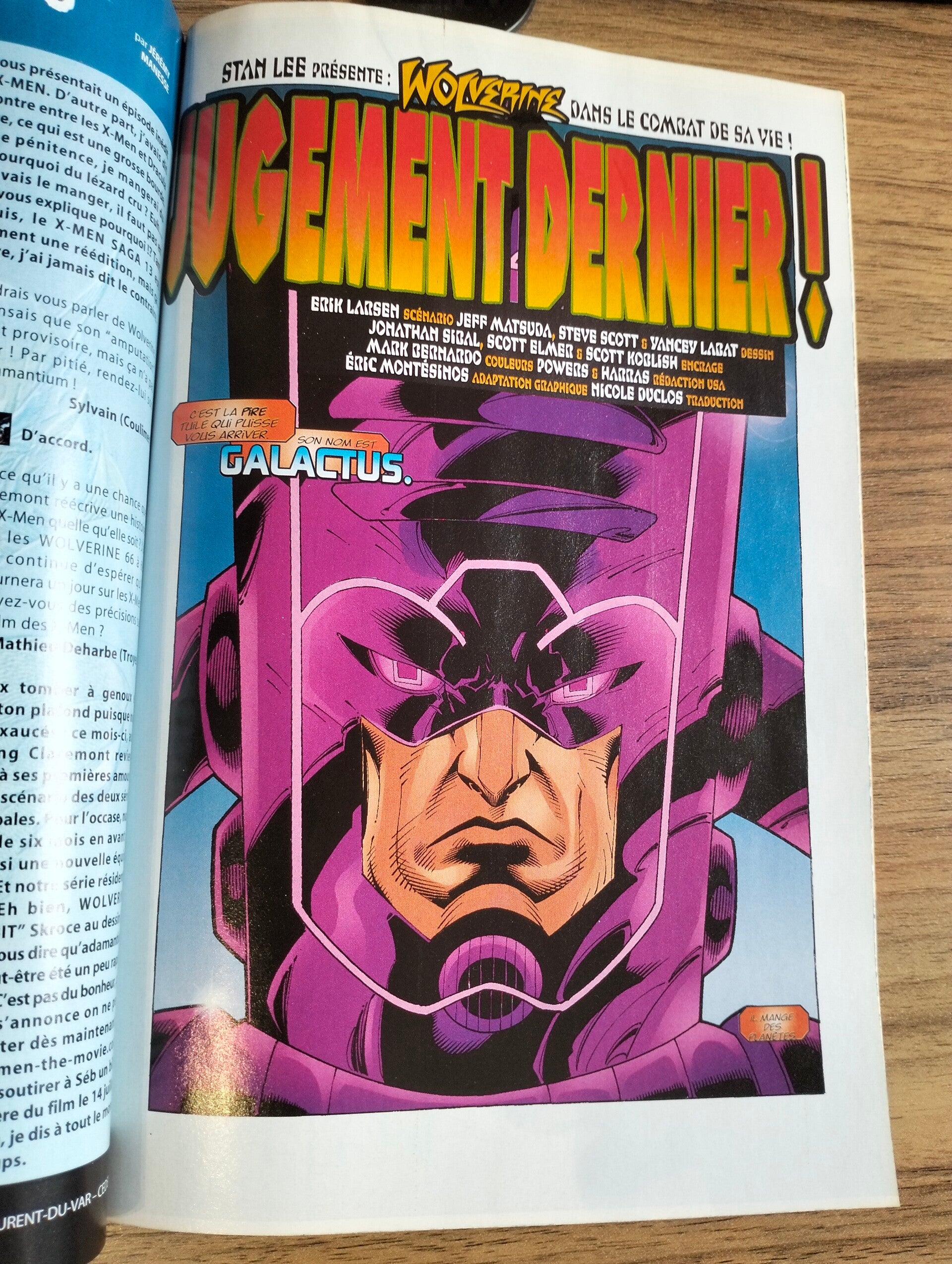 Est-ce que la couverture vous plaît ? Elle est remarquable à deux titres. Primo, elle est l'œuvre de Leinil Francis Yu, le fantastique dessinateur de WOLVERINE qui reviendra dans ces pages au cours des prochains mois. Secundo, elle montre Wolverine face à Galactus… et ça, je suis sûr que vous en bouche un coin ! C'est vrai que Wolvie aime bien affronter des adversaires plus forts que lui (comme Hulk), mais Galactus… cette force de la nature, cette créature quasi divine qui avale des planètes en guise de petit déjeuner ! Logan aura beaucoup de mal à le vaincre… sous réserve qu'il y arrive bien sûr ! Mais comment notre mutant griffu en est-il arrivé là ?
